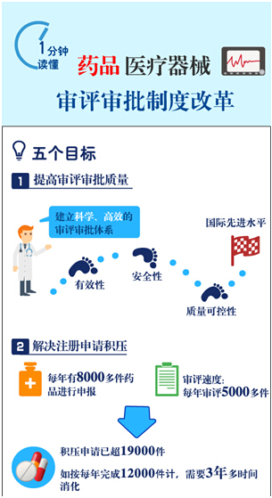 黨中央、國(guó)務(wù)院高度重視藥品醫(yī)療器械審評(píng)審批制度改革,推進(jìn)藥品醫(yī)療器械審評(píng)審批制度改革,核心就是提高藥品質(zhì)量,主要目標(biāo)是建立科學(xué)、高效的審評(píng)審批體系;2016年底前消化完注冊(cè)申請(qǐng)積壓存量,2018年實(shí)現(xiàn)按規(guī)定時(shí)限審批;力爭(zhēng)2018年底前完成國(guó)家基本藥物口服制劑與參比制劑質(zhì)量和療效一致性評(píng)價(jià);開(kāi)展藥品上市許可持有人制度試點(diǎn);提高審評(píng)審批透明度。通過(guò)改革,推動(dòng)醫(yī)藥行業(yè)結(jié)構(gòu)調(diào)整和轉(zhuǎn)型升級(jí),實(shí)現(xiàn)上市產(chǎn)品有效性、安全性、質(zhì)量可控性達(dá)到或接近國(guó)際水平,更好地滿足公眾用藥需求。