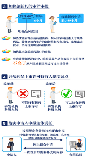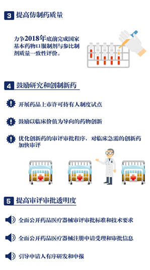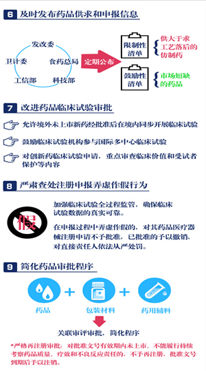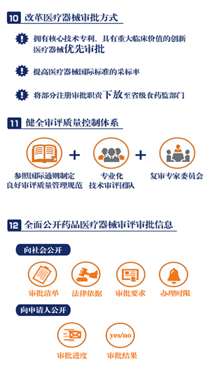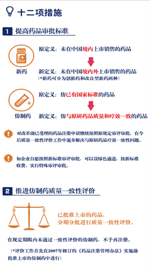 《意見(jiàn)》明確了改革的12項(xiàng)任務(wù),包括提高藥品審批標(biāo)準(zhǔn),推進(jìn)仿制藥質(zhì)量一致性評(píng)價(jià),加快創(chuàng)新藥的審評(píng)審批,開(kāi)展藥品上市許可持有人制度試點(diǎn),落實(shí)申請(qǐng)人申報(bào)主體責(zé)任,及時(shí)發(fā)布藥品供求和申報(bào)信息,改進(jìn)藥品臨床試驗(yàn)審批,嚴(yán)肅查處注冊(cè)申報(bào)弄虛作假行為,簡(jiǎn)化藥品審批程序、完善藥品再注冊(cè)制度,改革醫(yī)療器械審批方式,健全審評(píng)質(zhì)量控制體系,全面公開(kāi)藥品醫(yī)療器械審評(píng)審批信息。