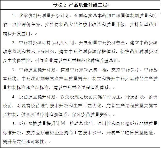 推動重點領(lǐng)域質(zhì)量提升。全面提升基本藥物質(zhì)量水平,落實仿制藥質(zhì)量和療效一致性評價要求,完成國家基本藥物口服固體制劑的一致性評價任務(wù)。完善中藥質(zhì)量標(biāo)準(zhǔn)體系,提升中藥全產(chǎn)業(yè)鏈質(zhì)量控制水平,提高產(chǎn)品質(zhì)量均一性和可控性。實施國家醫(yī)療器械標(biāo)準(zhǔn)提高行動計劃,開展與國際標(biāo)準(zhǔn)對標(biāo),制定在用醫(yī)療器械檢驗技術(shù)要求,推動企業(yè)改進產(chǎn)品設(shè)計、制造工藝和質(zhì)量控制,提升醫(yī)療設(shè)備的穩(wěn)定性和可靠性。加強藥用輔料和直接接觸藥品的包裝材料和容器的標(biāo)準(zhǔn)體系建設(shè),增加國家標(biāo)準(zhǔn)收載品種,鼓勵企業(yè)提高規(guī)范生產(chǎn)能力,提升質(zhì)量控制水平。推動企業(yè)建立完善測量管理體系,促進提質(zhì)增效。