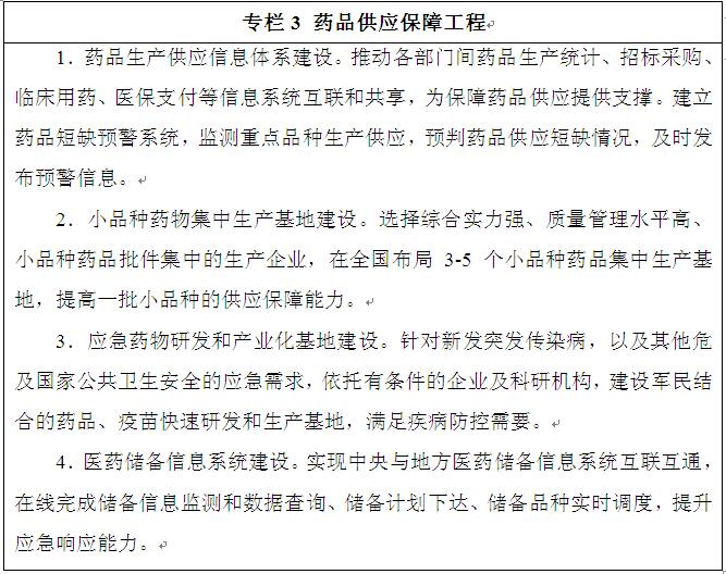 ——供應(yīng)保障。國家基本藥物、常用低價藥供應(yīng)保障能力加強,臨床用藥短缺情況明顯改善,臨床急需的專利到期藥物基本實現(xiàn)仿制上市,國家醫(yī)藥儲備體系進一步完善,應(yīng)對突發(fā)公共衛(wèi)生事件的應(yīng)急研發(fā)和應(yīng)急生產(chǎn)能力顯著增強。