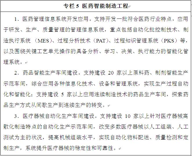 ——智能制造。到2020年,醫(yī)藥生產(chǎn)過程自動化、信息化水平顯著提升,大型企業(yè)關(guān)鍵工藝過程基本實現(xiàn)自動化,制造執(zhí)行系統(tǒng)(MES)使用率達到30%以上,建成一批智能制造示范車間。