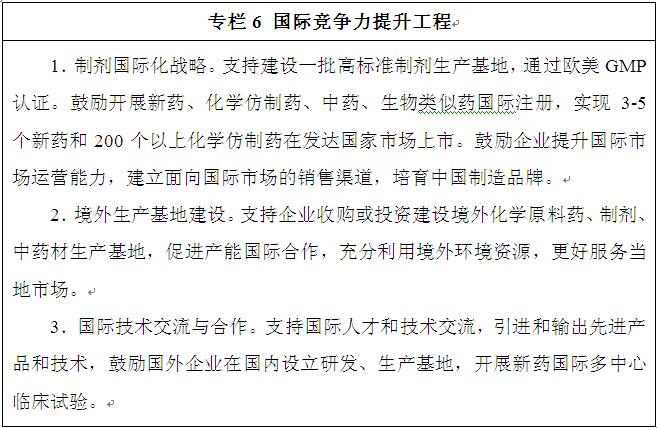加強國際技術(shù)合作。優(yōu)化投資環(huán)境,深化與國外醫(yī)藥企業(yè)合作,推動引資、引技、引智有機結(jié)合,實現(xiàn)合作共贏。支持企業(yè)建立跨境研發(fā)合作平臺,充分利用國際資源,發(fā)掘全球創(chuàng)新成果。鼓勵開展新藥國際臨床研究,實現(xiàn)創(chuàng)新藥走向國際市場和參與國際競爭。引領(lǐng)中藥國際標(biāo)準(zhǔn)制定,為中藥走出去創(chuàng)造條件。